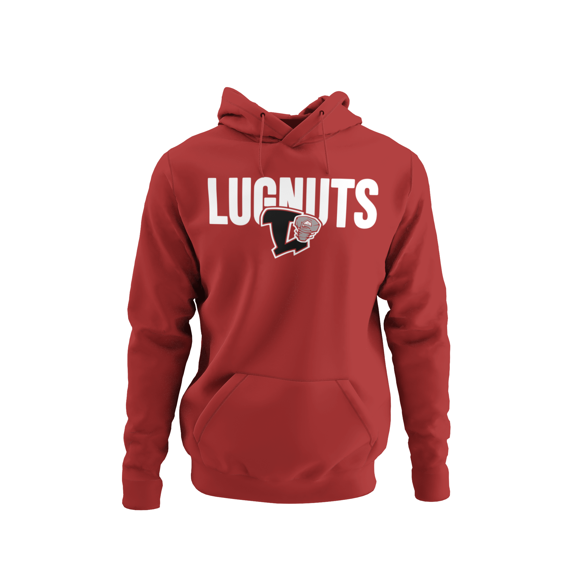 Crafted in a rich crimson with an oversized, relaxed fit, this hoodie brings streetwear style to team pride. The signature Lugnuts graphic—featuring a bold typographic design with a cartoonish hand gripping a metallic lug nut—transforms everyday wear into premium team gear. Heavyweight cotton-poly blend, ribbed cuffs, and a classic kangaroo pocket make this your go-to layer for tournament weekends, team dinners, and those crisp morning warmups.